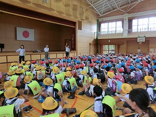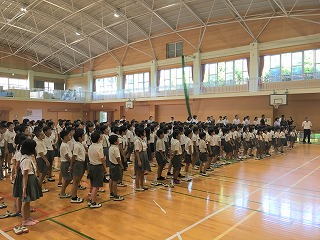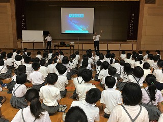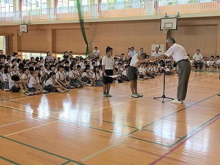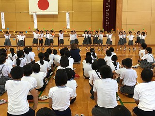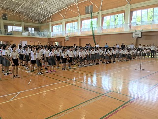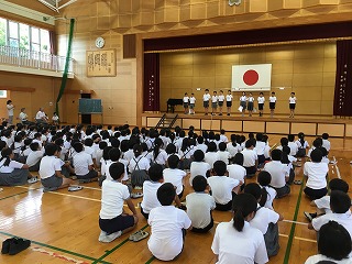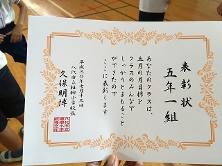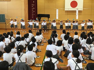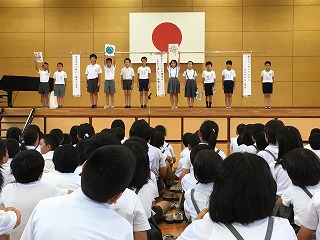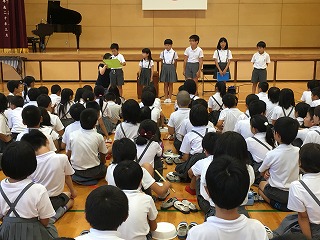 | ☆平成30年7月13日(金) ・環境ISO委員会が発表をしました。 【体育館;環境ISO委員会】 【3つの取組を発表】 ・①「進んでリサイクルをし、ゴミをへらします。」 ②「教室やトイレの電気をこまめに消して、節電します。」 ③「水を大切に使い、節水します。」 ★地球のため、みんなの笑顔のために、環境にやさしい取組をしていきましょう。 〇児童集会がありました② ・1年生の学年発表もありました。 【1年生の発表】 ・1組、2組いっしょに「♪にじ」を歌いました。 【1年1組】 【1年2組】 ★手にカラフルな花紙をつけて、「♪ラーラーラー、にじが、にじがー、空にかかってー…」と、歌いました。かわいかったです。 〇児童集会がありました③ ・ハートフル委員会からの表彰がありました。 【表彰状;5年1組】 ・5年1組と6年2組が、5月の月目標を頑張ったので、表彰されました。 【児童集会;今月の歌】 ・児童集会は、今月の歌を歌って終わります。蒸し暑い体育館でしたが、みんな元気よく歌えました。 |