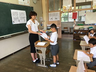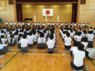 | ☆平成30年7月20日(金) ・1学期は70日間(6年生は71日)でした。1時間目、体育館で終業式がありました。 【校長先生の話①】 ・「一学期を振り返り、『最高の夏休み』にするため、3つのお願いを話します。」 ・「1つめ『守る』。何を守るでしょう?」全校児童にたずねられました。子どもたちは近くの友達と話し、発表しました。 (児童)「命を守る!」「ルールを守る!」など、校長先生が話さなくても、子どもたちは、自分たちで守るべきことをしっかりと自覚していました。 【校長先生の話②】 (校)「2つめは『続ける』。」 (児)「勉強を続けます!」「家のお手伝いを続けます!」「習い事を続けます!」 (校)「3つめは『感動する』。一学期、何に感動しましたか。」 (児)「運動会に感動しました!」「組体操です!」 (校)「39日間の夏休み、守り、続け、感動できる『最高の夏休み』にしてください。」 【交通安全担当の先生からの話】 ・危険予想訓練をしました。児童が実際に歩く通学路の写真をもとに、どんな危険が潜んでいるか、みんなで考えました。 ・「飛び出し」や「危険なブロック塀」に気をつけることを確認しました。 ☆そのほか、生徒指導担当や保健、体育の先生から話がありました。 ↓↓↓↓↓↓↓ ★重要★ ・熱中症に気をつけましょう…出かけるときは「帽子」「水筒」「30分ごとの休憩を」 ・10時まではおうちで学習、帰宅時刻は午後6時。 ・プール開放は7回…監視員さんの指示に従い、安全で楽しいプールにしましょう。 【校歌斉唱】 ・みんなで元気よく歌いました。 ★終業式の後・・★ 【児童発表】 ・各学年1名の児童が、1学期に頑張ったことや夏休みに頑張りたいことを話しました。 ☆表彰☆ 【歯のポスターの表彰】 【陸上の表彰】 ・県大会で3位でした。おめでとうございます。 【熱中症対策の扇風機】 ・午前9時、体育館内の気温は31.5度。6台の大型扇風機がフル稼働でした。おかげで、具合を悪くする子は一人もいませんでした。 〇大掃除がありました ・終業式のあとは大掃除。30分間、みんなで協力して学校をきれいにしました。 【大掃除の様子;2年1組】 〇学級活動がありました ・夏休みの暮らしについて先生の話を聞いたり、通知表や宿題をもらったりしました。 【1年1組教室】 ・1年生にとっては初めての通知表。みんな嬉しそうに通知表を見ていました。 〇最高の夏休みを過ごしましょう。 【下校する児童】 ・元気に2学期会いましょう! |