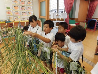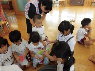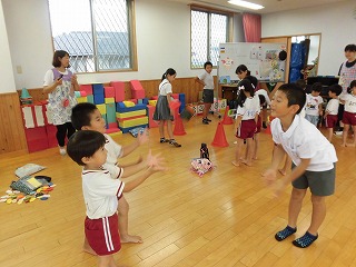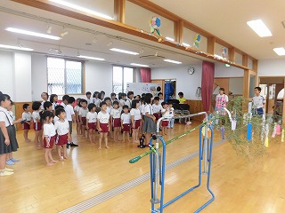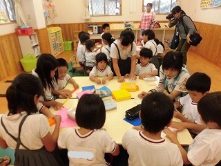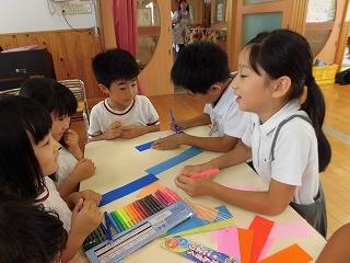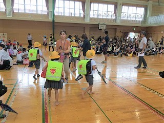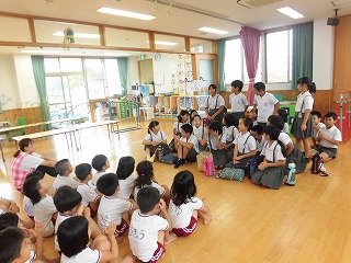 | ☆平成30年7月5日(木) ・4年生が、植柳幼稚園、いずみ保育園へ交流に行きました。4年生43名が2つに別れ、いずみ保育園と植柳幼稚園へ行きました。 ☆いずみ保育園☆ 【出会いのあいさつ】 【交流活動;七夕①】 ・七夕のねがいごとを一緒に考えて、短冊に書きました。 【交流活動;七夕②】 ・短冊を笹竹に結びました。4年生がやさしく園児のお世話をしました。 【交流活動;七夕③】 ♪みんなで七夕の歌を歌いました。 【交流活動;グループ遊び①】 ・折り紙遊びをしました。いろいろな作り方を教えてあげました。 【交流活動;グループ遊び②】 ・紙風船を作りました。投げたり取ったりして遊びました。 【交流活動;グループ遊び③】 ・手作りの輪投げ遊びをしました。 【プレゼント渡し】 ・交流の最後に、4年生が作ったメダルや折り紙などをプレゼントしました。 ☆保育園のお友達が楽しく遊べるよう、自分たちで計画と準備をしました。たくさんの笑顔が見られ、交流会は大成功でした。 |