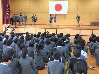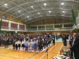 | ☆平成30年12月2日日曜日 〇いずかし集会がありました ・12時30分から、体育館でいずかし集会がありました。 【オープニング】 ・今年も、三中の箏曲部の生徒さんが演奏してくれました。 【はじめの言葉】 ・校長先生の話。いずかし集会に使われている「厳橿(いずかし)」の由来など話されました。 【みんなで歌いましょう】 ・♪「赤とんぼ」を歌いました。指揮は、放送委員会の6年生です。 ★各学年の発表;前半★ 【4年生の発表】 ・「先人の心にふれて」。通潤橋を作った布田保之介、萩原堤を作った稲津八右衛門など、4人の先人について発表しました。「花は咲く」の斉唱、「島唄」の合奏もしました。 【5年生の発表】 ・「チャレンジ!5年生!!伝えよう、私たちの宝~これからさきも伝え続けよう花房踊り・盆踊り、水俣で見つけた宝物~」。伝統文化の学習で学んだこと、水俣に学ぶ肥後っ子教室で学んだことを発表しました。 ★クラブ活動の発表★ 【和太鼓クラブ】 ・♪「太鼓ドドン!」 【合唱クラブ】 ・アカペラで♪「おてもやん」を歌いました。指揮は閘先生です。 【職員合唱】 ・手話を交えて、♪「すてきな友達」を歌いました。 ★各学年の発表;後半★ 【1年生の発表】 ・「音楽物語『おしいれのぼうけん』」。ミュージカル風に発表。かわいいダンスと衣装でした。 【3年生の発表】 ・「わたしたちの今そしてこれから~守っていこう植柳の宝~」。旧講堂と栽柳園について調べて学んだことを群読にして発表しました。 【6年生の発表】 ・「生きる~守り続けたい大切なもの~」。修学旅行で学んだ平和の尊さ、総合的な学習で調べた妙見祭、多くの人への感謝の言葉など、呼びかけ、歌、寸劇、朗読など、様々な形式で発表しました。 【保護者、地域の方、卒業生など】 ・日曜日の開催でしたので、たくさんの参加者がありました。参観、ありがとうございました。 【校歌斉唱】 ・歴史ある植柳小の校歌を、参加者全員で歌いました。今年も、素晴らしい「いずかし集会」でした。 |