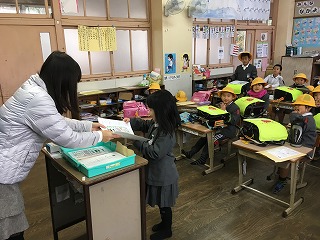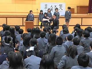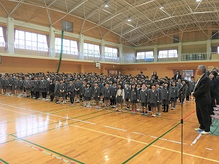 | ☆平成30年12月26日水曜日 〇終業式がありました ★朝の様子★ 【2学期最後の登校】 ・雨も降って寒い中、防犯協会の政木さんと教頭先生が登校指導。朝早くから子供たちの安全のため、ありがとうございました。 【駅伝の練習】 ・体育館で10分間走をしました。「♪君は、シンデレラガール…」軽快なリズムに乗って、自分のペースで走りました。 ★終業式★ ・2学期は8月29日から12月26日まで81日間でした。2学期の終業式がありました。 【校長先生の話①】 ・「校長先生の通知表」として、すべての学年の学習や行事の頑張りを話されました。 ・「1年生はあいさつ上手でしたね。給食もよく食べ、食缶はいつも空っぽでした。…6年生のいずかし集会の発表は感動しました。…お互い本音で語り合えた授業も素晴らしかったです。」 【校長先生の話②】 ・「2学期はたくさんの山(行事)が待ってるよ。『さあ、山に登ろう!』をめあてに頑張ってきました。頂上からたくさんの頑張りを眺められた2学期でしたね。」 ・「今年の一字は『災』でした。いろいろあった一年だったと思います。反省するところは反省し、新しい年を迎えてください。」 【各学年の発表】 ・1年生から6年生まで、代表の児童が2学期の頑張りや思い出を発表しました。 ・ジョギングタイムでたくさん走った、いずかし集会の台詞を頑張って覚えた、あしきた青少年の家では力を合わせてペーロン船を漕いだ、陸上記録会に向けて努力した、などそれぞれの頑張りがうかがえました。 【校歌斉唱】 ・みんなで元気よく校歌を歌いました。 【5年生の田中さんがピアノ伴奏】 ・ピアノ伴奏者が6年生から5年生にバトンタッチ。初めて全校の前で弾きました。緊張した中、最後まで見事に演奏できました。パチパチ! 【高学年が片付け】 ・集会の準備や後片付けは、毎回5,6年生が率先して動いてくれます。今日もありがとう! ★学級活動★ 【2年生;学級活動】 ・1時間目は終業式、2時間目は大掃除、3時間目は学級活動で冬休みの暮らしや宿題について、担任の先生から話を聞きました。 【1年生;通知表をもらいました】 ・4時間目、2学期の通知表を担任の先生から一人一人もらいました。みんなよく頑張りましたね。 ★下校の様子★ 【下校指導】 ・明日から冬休み。元気に12日間を過ごし、266名全員が1月8日の始業式を迎えられるといいですね。 |