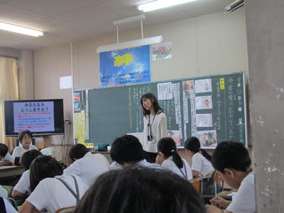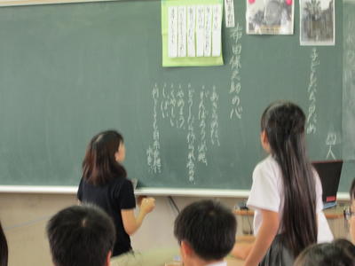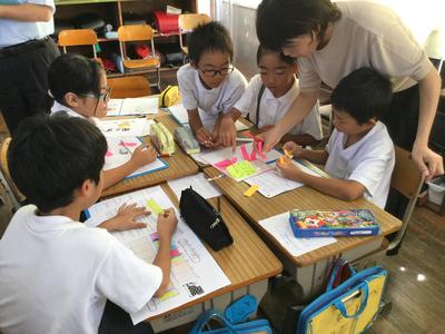 「It was ~」という表現を使って夏休みに行った場所とそのときの気持ちの表現について学習しました。