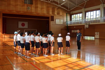スポーツクラブらしいすばらしい返事や気をつけをしていました。