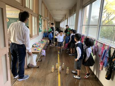 イチョウの葉やどんぐりを入れたペットボトルをピンにして、ボーリングをしました。