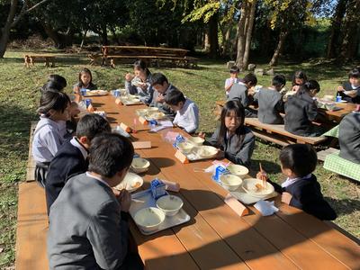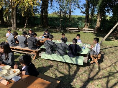 今日は晴れていたので、気持ちよく外で給食を食べることができました。