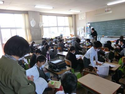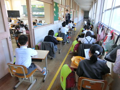 (新型コロナウイルス対策で、机同士の間隔を広く取っているので数名廊下で過ごしています。)