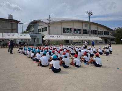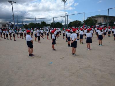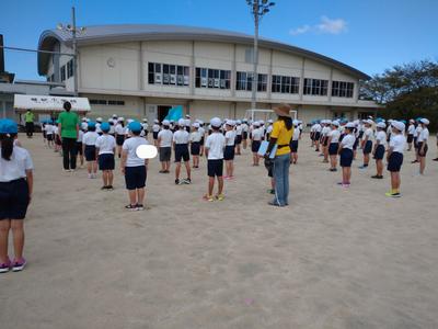 前回は雨のため、放送での練習でしたが、今回は外で行うことができました。