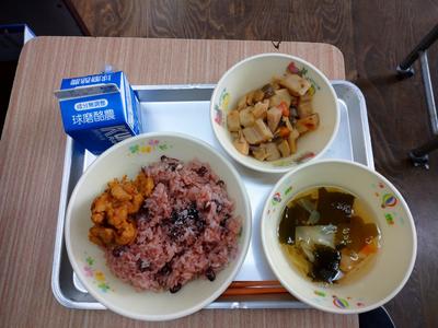 牛乳、赤飯、鶏の唐揚げ、すまし汁、煮しめ、ごま塩 でした。