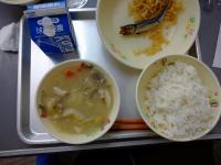 牛乳、麦ご飯、めざし、たくあんのごまいため、豚汁