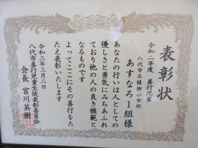 毎週、あすなろ1組が朝から行っているゴミ拾いが善い行いとして表彰を受けました。