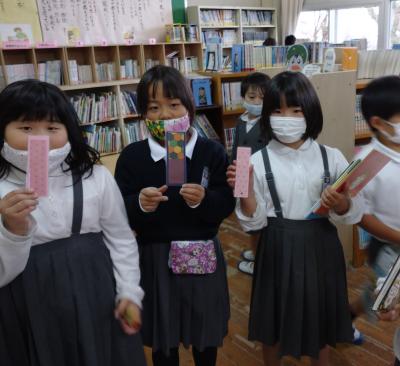 しおりをもらった1年生が嬉しそうに見せてくれました。にっこり