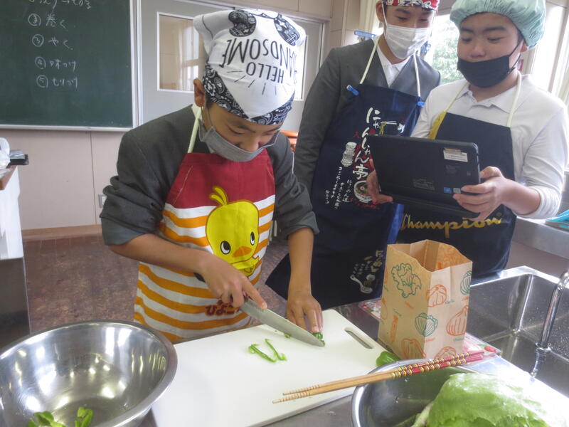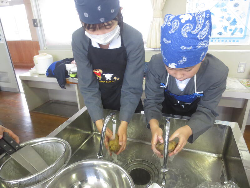 6年生が、調理実習でジャーマンポテトとベーコン巻きを作りました。