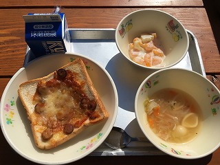 | ☆10月30日(月) 《献立》 ・ピザトースト、マカロニスープ、フルーツヨーグルト、牛乳 《献立ひとくちメモ》 ・ヨーグルトは、乳を乳酸菌や酵母で発酵させたものです。牛乳などの栄養に加え、乳酸菌のはたらきで効果もパワーアップしています。腸内の悪玉菌をおさえて、有害なものが作られるのを防いだり、腸内の調子を整えたりします。 【おそらく初めて給食に登場、ピザトースト】 |
