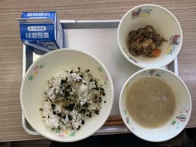 わかめごはんの具、麦ごはん、肉じゃが、みそ汁、牛乳