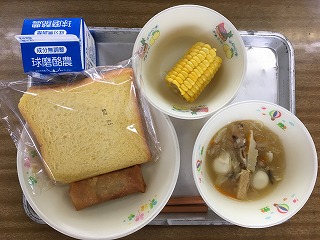 | ☆6月6日(水) 《献立》 ・かぼちゃパン、タイピーエン、とうもろこしの塩ゆで、春巻き、牛乳 《献立ひとくちメモ》 ・とうもろこしには、でんぷんが多く、また、ゆでてもあまりビタミンが失われないのが特徴です。とうもろこしの実の皮には、おなかの掃除をしてくれる食物繊維が豊富に含まれています。しっかりとかんで食べましょう。 【2年2組の様子】 ・給食の準備をしていました。 |