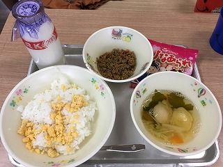 | ☆3月1日(水) 《献立名》 ★ひなまつり行事食 ・三色そぼろごはん(ごはん、いり卵、きざみのり、肉そぼろ)、つみれ汁、ひなあられ、牛乳 ※きざみのりはありませんでした。 《献立ひとくちメモ》 ・今日は、ひな祭り行事食です。日本には、平安時代を起源とする「五節句」という行事があり、季節の節目に身の穢れを祓って、健康長寿や厄除けを願う風習がありました。ひな祭りは、「桃の節句」で、ひな人形を飾り、ひし餅やあられを供えて、女の子の誕生と成長をお祝いします。 〈麦島学校給食センター献立表より〉 【一足早い、ひな祭りの行事食でした】 |
