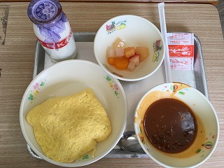 | ☆3月2日(木) 《献立名》 ・オムハヤシライス(麦ごはん、ハヤシライスの具、うすやき卵)、季節のフルーツカクテル、ミルメーク、牛乳 《献立ひとくちメモ》 ・日本では本格的に牛肉が食べられ始めたのは、明治の文明開化以降、牛なべ屋が流行したのがきっかけです。牛肉日は、現在では肉じゃが、すき焼き、ビーフカレー、ハヤシライスなど和食・洋食問わずいろいろな料理に使われています。 〈麦島学校給食センター献立表より〉 【子供たちが大好きなメニューでした】 |