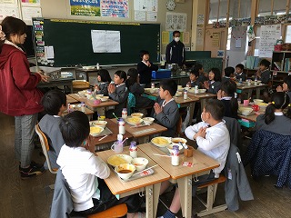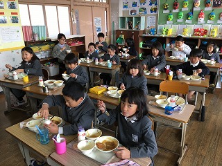 【1年1組の給食の様子;給食も明日が最後ですね】 |