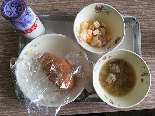 | ☆3月6日(月) 《献立名》 ・きなこ揚げパン、肉だんごスープ、ヨーグルト和え、牛乳 《献立ひとくちメモ》 ・ヨーグルトが生まれたのは、およそ7000年前といわれ、生乳が入った容器に偶然乳酸菌が入り込んだのが始まりと考えられています。ヨーグルトの乳酸菌は、腸内の悪玉菌を減らし、腸内の環境を整えます。 【子どもたちが大好きなきなこ揚げパンでした】 |