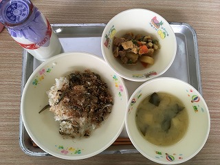 | ☆3月9日(木) 《献立名》 ・麦ごはん、みそ汁、うま煮、手作り佃煮、牛乳 《献立ひとくちメモ》 ・いりこは、カタクチイワシを煮て干したもので、大きさによって呼び名が変わり、小さい順に、ちりめんじゃこ、かえりいりこ、いりこと呼ばれます。かえりいりこの大きさは、3.5cm~4.5cmで、カルシウム、鉄分、ビタミンなどをたくさん含んでいます。 【カルシウムたっぷりの和風の給食でした】 |