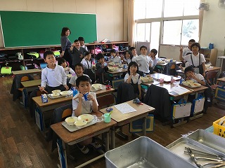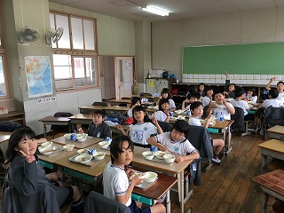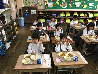 【2年1組の給食の様子】 ・半分のくらいの子どもたちが食べていました。 |