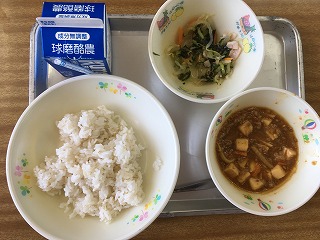 | ☆4月28日(金) 《献立名》 ・麦ごはん、マーボー豆腐、中華サラダ、牛乳 《献立ひとくちメモ》 ・もやしは、350~400年ほど前から、料理に利用され始めました。緑豆、大豆、小豆、ササゲなどの主に豆類を用いて、光をさえぎって発芽させ、食用します。天候に左右されず、価格が安定しているため、使いやすい食材です。 【マーボー豆腐をご飯にかけて食べる子もいました】 |