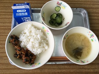 | ☆5月17日(水) 《献立》 ★和食を味わう献立 ・麦ごはん、みそ汁、黒皮かぼちゃのそぼろ煮、手作り佃煮、牛乳 《献立ひとくちメモ》 ・黒皮かぼちゃは、日本かぼちゃの一種で、実に粘り気が強く、日本料理に欠かせない材料の一つです。日本かぼちゃは、栽培に手間がかかり終了が少ないこと、甘みの強い西洋かぼちゃが好まれることから、現在の生産量は全体の10%以下となっています。 【栄養バランスの良い和食の給食でした】 |