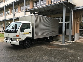 【給食センターの車が到着】 ・今日は12時5分から給食でした。配達車は11時40分頃到着。いつもほかほかの給食をいただいています。 |