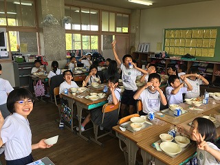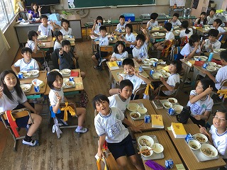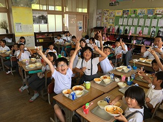 【4年1組;ALTのアーロン先生と一緒に食べました】 |