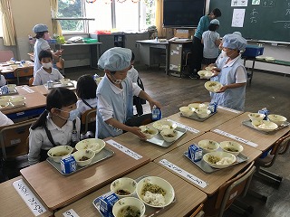 【4年2組の配膳の様子】 ・みんなで協力して準備をしていました。 |