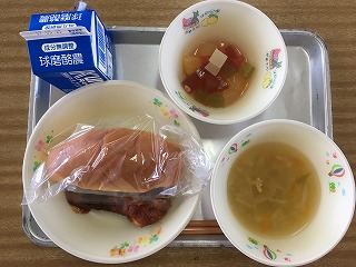 | ☆5月18日(木) 《献立》 ・ミルクパン、ポテトスープ、魚のバーベキューソース、フルーツのサングリア、牛乳 《献立ひとくちメモ》 ・すいかの出荷は、熊本県から始まります。鹿本や熊本、上益城などの県北を中心に栽培され、ピークは5月です。シトルリンという遊離アミノ酸や、トマトの1,5倍のリコピン、疲労回復・利尿作用のあるカリウムが含まれています。 【フルーツサングリアの中にスイカが入っていました】 |