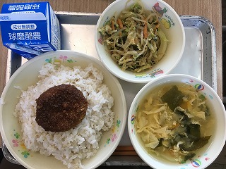 | ☆5月11日(木) 《献立》 ・セルフひじきごはん(ごはん、ひじきごはんの具)、魚の天玉揚げ、すまし汁、牛乳 《献立ひとくちメモ》 ・今日のごはんは、「ひじきごはん」です。そこで今日は「ひじき」のクイズを出したいと思います。ひじきは海でとれますが、海の中では何色をしているでしょうか?①黒色②おうど色③白色、、、答えは、②の「おうど色」です。ひじきは、海の中ではおうど色ですが、乾燥させると黒い色になります。 ・写真はありません・・・。 |