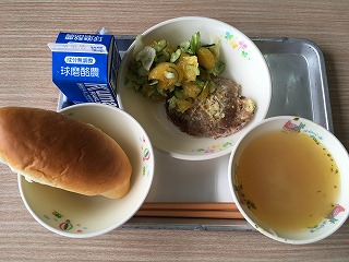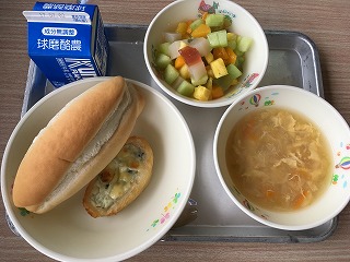 | ☆6月26日(月) 《献立》 ・ソフトフランスパン、トマト団子のスープ、ポテトグラタン、フルーツカクテル、牛乳 《献立ひとくちメモ》 ・パイナップルは、原産地がブラジルで、トロピカルフルーツ(熱帯産の果物)の一種です。たんぱく質分解酵素を含んでいるので、肉料理と合わせると、消化・吸収を助ける働きをします。今日は、カクテルゼリーとあわせてフルーツカクテルにしました。 【フランスパンやフルーツカクテルなど、洋風メニューでした】 |