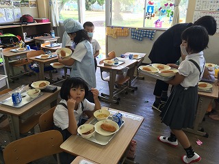 | ☆7月3日(月) 《献立》 ★麦島小2年1組リクエスト給食 ・きな粉揚げパン、卵スープ、ウインナーのケチャップソース、牛乳 《献立ひとくちメモ》 ・今日は、麦島小2年1組のリクエスト給食です。卵は、良質なたんぱく質を多く含んでいます。卵黄に含まれているレシチンは、記憶力や集中力の向上など、脳の活性化に効果があります。また、鉄分が多く含まれているので、貧血の予防にもなります。 【リクエスト給食でした】 |