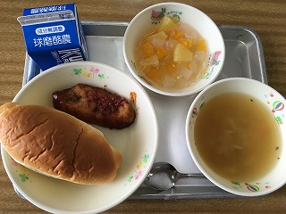 | ☆9月6日(水) 《献立》 ・ミルクパン、ポテトのスープ、魚のバーベキューソース、歩フルーツジュレ、牛乳 《献立ひとくちメモ》 ・ナタデココは、ココナッツの汁を発酵させて作られた寒天状の食べ物です。フィリピン生まれの食べ物で、独特の歯ごたえがあります。今日は、フルーツジュレの中にナタデココを入れています。 【さっぱりしたメニューでした】 |