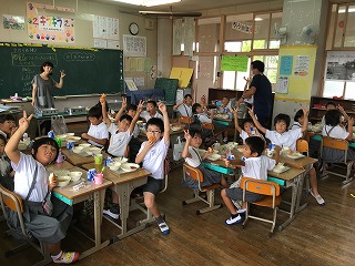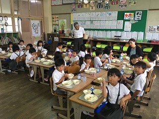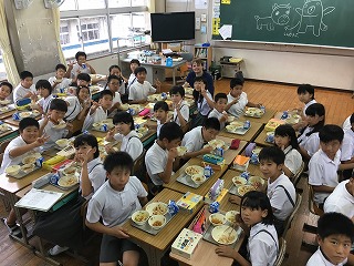 【6年教室;ジョー先生と一緒に給食】 |