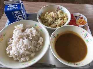 | ☆9月15日(金) 《献立》 ・ビーフカレーライス、マカロニサラダ、デザート、牛乳 《献立ひとくちメモ》 ・スキムミルクは、牛乳から脂肪分を取り除いたものを乾燥させて、粉場にしたものです。牛乳と同じように良質なたんぱく質やカルシウムが豊富に含まれていますが、脂肪分は約40分の1だそうです。 【子どもたちが大好きなカレーライス】 |