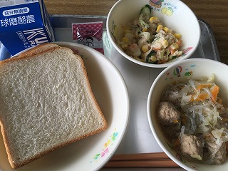| ☆9月19日(火) 《献立》 ・食パン、大豆チョコ、肉だんごスープ、ツナサラダ、牛乳 《献立ひとくちメモ》 ・今日は、麦島幼稚園ふじ組のリクエスト給食です。キャベツには、春が旬のものと冬が旬のものがあります。冬に収穫される冬キャベツは、巻きがしっかりしていて、加熱調理しても煮くずれしにくいです。春に収穫される春キャベツは、みずみずしく柔らかいので、サラダなど生で食べる料理に適しています。 【久しぶりの食パンでした】 |
