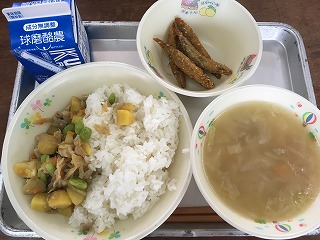 | ☆9月21日(木) 《献立》 ★ふるさと元気っこメニュー ・セルフ栗ごはん、しょうがのだご汁、きびなごフライ、牛乳 《献立ひとくちメモ》 ・今日は、ふるさと元気っこメニューです。秋の味覚の代表である栗。熊本県は平成28年度、全国で第2位の生産量を誇っています。品種には「利平(りへい)」、「筑波(つくば)」、「銀寄(ぎんよせ)」などがあり、茹でて食べたり、お菓子や栗きんとんに使われています。今日の給食では、栗ごはんにしています。旬の栗で秋を感じてください。 【旬の栗やきびなごが美味しい給食でした】 |