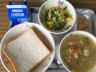 | ☆9月4日(月) 《献立》 ★三中2-1リクエスト給食 ・食パン、ジャム、甘夏サラダ、ポトフ、牛乳 《献立ひとくちメモ》 ・今日は、三中2年1組のリクエスト給食です。甘夏みかんは、おもに熊本や愛媛などで栽培されています。さっぱりとした酸味と甘みが特徴です。暖かい時期にぴったりのさわやかな味わいです。また、甘夏には、クエン酸が含まれていますので、疲れたときにも最適のフルーツです。 【久しぶりの学校給食はおいしかったです】 |
