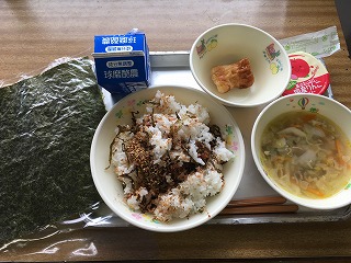 | ☆9月5日(火) 《献立》 ★防災メニュー ・セルフおにぎり(ごはん、のり、おかか)、塩豚汁、ちくわの煮物、デザート、牛乳 《献立ひとくちメモ》 ・今日は、9月1日の「防災の日」にちなんだ防災メニューです。「防災の日」は、1923年のこの日に起きた関東大震災の教訓を忘れないという意味と、この時期に多い台風への心構えの意味も含めて1960年に制定されたものです。この日は、台風や津波、地震などの災害についての理解を深め、対処するための準備をする日です。家庭では緊急時の準備ができていますか?いざという時に備え、日頃から避難場所の確認や非常持ち出し袋を用意しておきましょう。中身は、缶詰めなどの非常食や水、懐中電灯など一人で持ち出せる最低限のものを詰め、1年に1回は点検し、缶詰めや水、電池などは新しいものと交換するようにしましょう。 【大きなのりにご飯とおかかをいれておにぎりにしました】 |