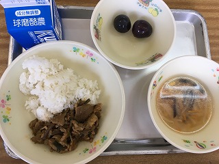 | ☆9月8日(金) 《献立》 ・スタミナ丼(ごはん、スタミナ丼の具)、中華スープ、くだもの、牛乳 《献立ひとくちメモ》 ・ぶどうは、6月頃から店頭に並び始め、品種によって収穫時期は異なりますが、10月頃までおいしい旬の時期となります。紫色の皮に含まれる「アントシアニン」は、目の疲れをやわらげ、視力向上に効果があると言われています。 【お肉をご飯と混ぜて食べました→スタミナ丼!】 |