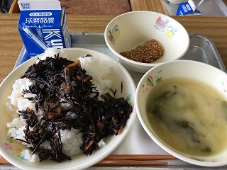 | ☆9月14日(木) 《献立》 ★和食を味わう献立・敬老の日メニュー ・セルフひじきごはん、みそ汁、魚のごま揚げ、牛乳 《献立ひとくちメモ》 ・今日は、和食を味わう日の献立「敬老の日」メニューです。「まごはやさしい」とは、、健康な食生活に役立つ和の食材の最初の文字を覚えやすく言い表したものです。「ま」は豆類、「ご」はごま、「わ」はわかめなどの海草類、「や」は野菜類、「さ」は魚類、「し」は椎茸などのきのこ類、「い」は芋類です。 【和食を味わうメニューでした】 |