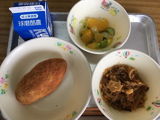 | ☆9月6日(水) 《献立》 ・ミルクパン、ポテトのスープ、魚のバーベキューソース、歩フルーツジュレ、牛乳 《献立ひとくちメモ》 ・ナタデココは、ココナッツの汁を発酵させて作られた寒天状の食べ物です。フィリピン生まれの食べ物で、独特の歯ごたえがあります。今日は、フルーツジュレの中にナタデココを入れています。 【さっぱりしたメニューでした】 |