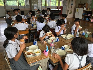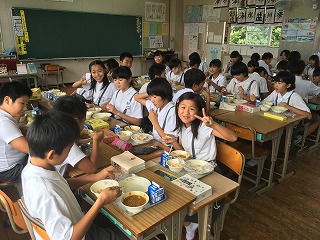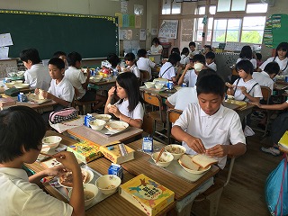 | ★2学期最初の給食 【2年1組の給食の様子】 ・教育実習の宮坂先生と一緒に食べました。 ★給食センターのみなさん、2学期もよろしくお願いします。 |