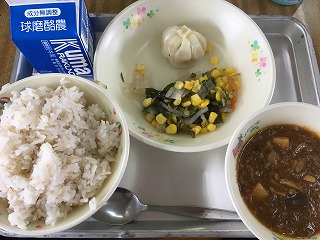 | ☆9月22日(金) 《献立》 ・麦ごはん、マーボーなす、ショウロウンポウ、こんにゃくサラダ、牛乳 《献立ひとくちメモ》 ・なすは、夏から秋が旬の野菜です。なすは種類が多く、約170種類もあるそうです。色も紫、黒、白、緑といったものがあり、形は長いもの、丸いもの、小さいものなどがあります。なすは、約94%が水分なので、味がさっぱりしていて、煮物、焼き物、漬物など、いろいろな料理に使われます。 【マーボーなすをご飯にかけて食べる子もいました】 |