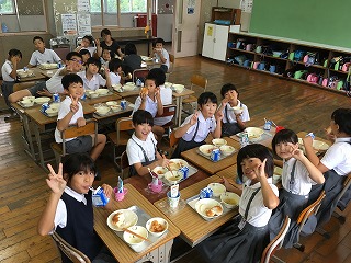 【3年生の給食の様子】 ・「おいしいで-す!」と、ピースサイン。 |