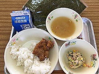 | ☆11月9日(木) 《献立》 ★麦島小2年2組リクエスト給食 ・セルフ手巻き(ごはん、焼きのり、ツナサラダ、練り梅)、オニオンスープ、鶏のから揚げ、牛乳 《献立ひとくちメモ》 ・玉ねぎは、生のときは特有のにおいがありますが、しっかり炒めることで甘味が出ます。これは硫化アリルという成分が過熱により分解され、甘みを出すためです。オニオンスープにもたっぷりと玉ねぎを使い、しっかり炒めることで、自然の甘みを出しています。 【焼きのりにごはんや具を入れて手巻きにしました】 |