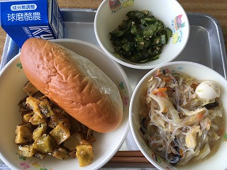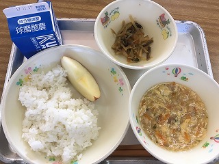 | ☆11月8日(水) 《献立》 ・ミルクパン、トマトのタイピーエン、きゅうりの香味あえ、大学芋、牛乳 《献立ひとくちメモ》 ・大学芋は、さつまいもを油で揚げて、甘いたれをからめたのものです。たれは、水あめ、砂糖、酢、しょうゆを炊いて作ります。さつまいもには、糖質だけでなく、ビタミンCも多く含まれているので、おやつにも最適です。 【八代ならではの給食、トマトタイピーエン】 |