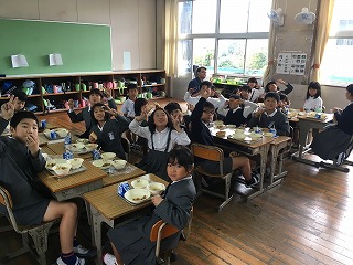 【4年1組の給食の様子】 ・みんなナイスポーズで写ってくれました。給食はみんなを笑顔にしてくれますね。 |